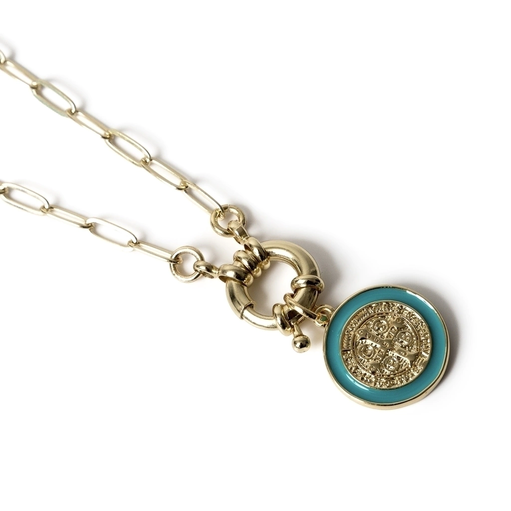 Collar de 45cm bañado en oro 18k, con cierre marinero y medalla de San Benito bañado en oro 18k y esmaltado en color